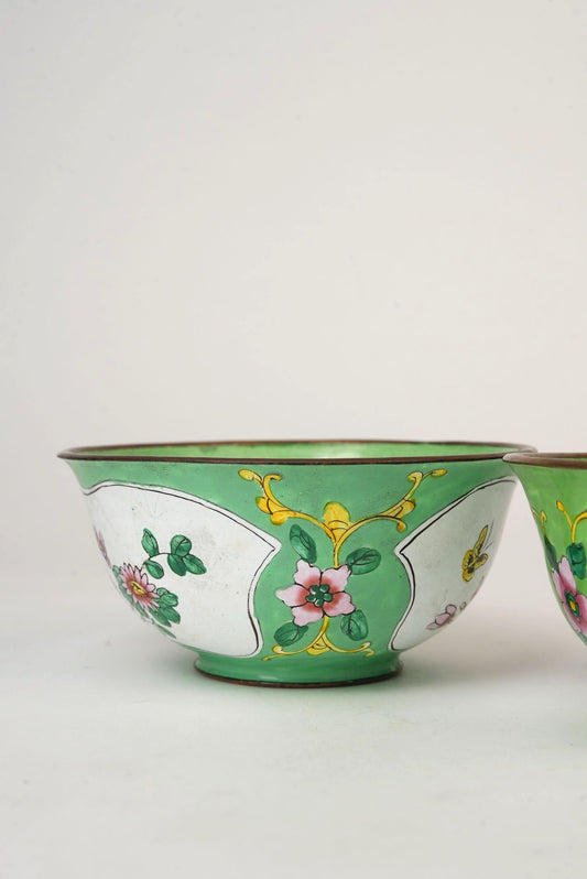 Pair of Hand‑Painted Apple‑Green Enamel Bowls