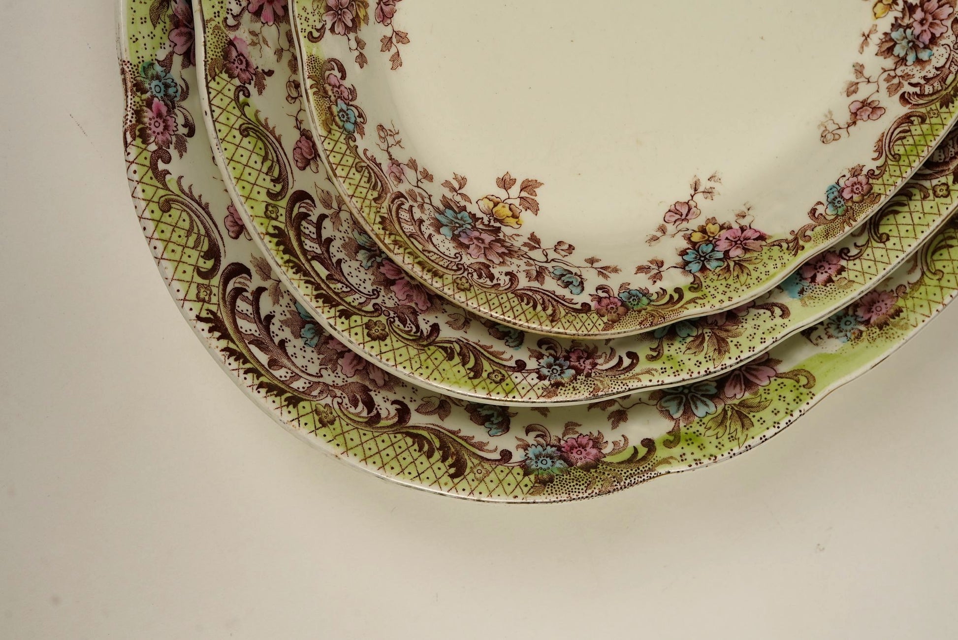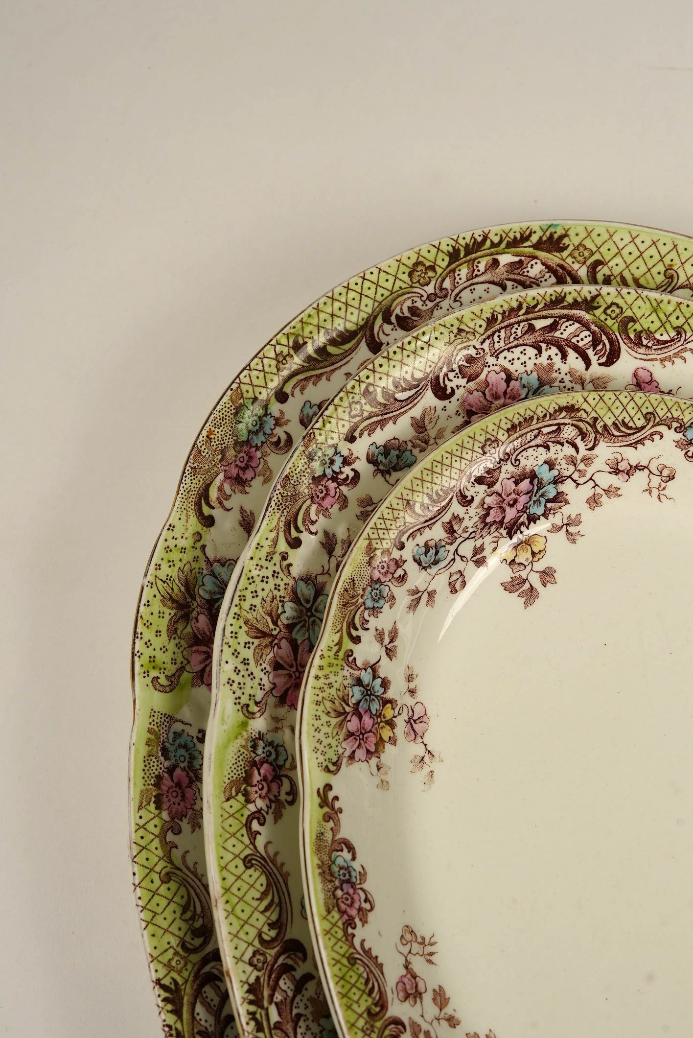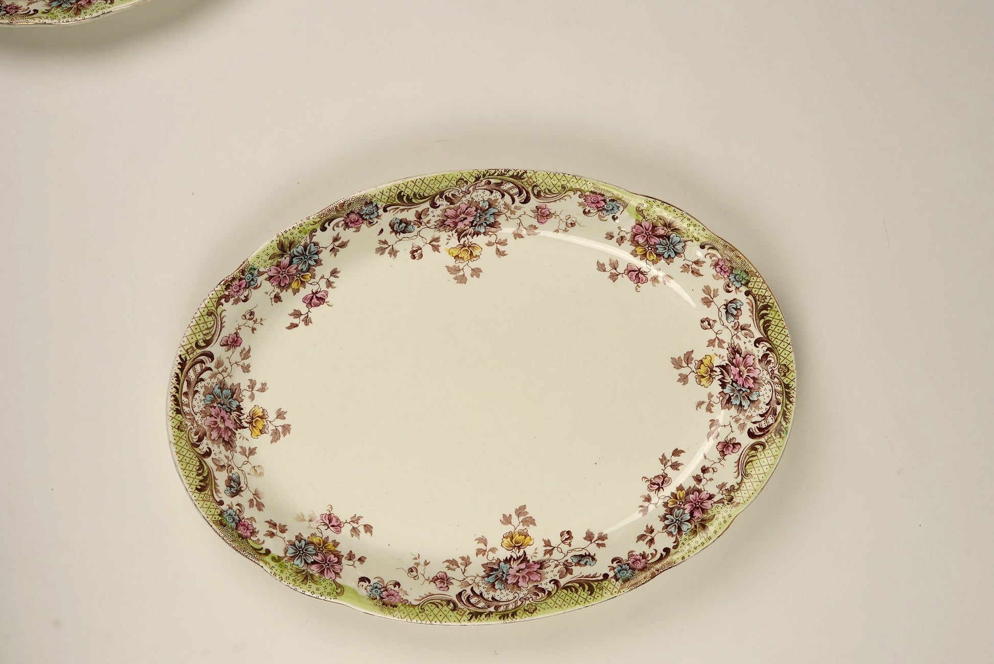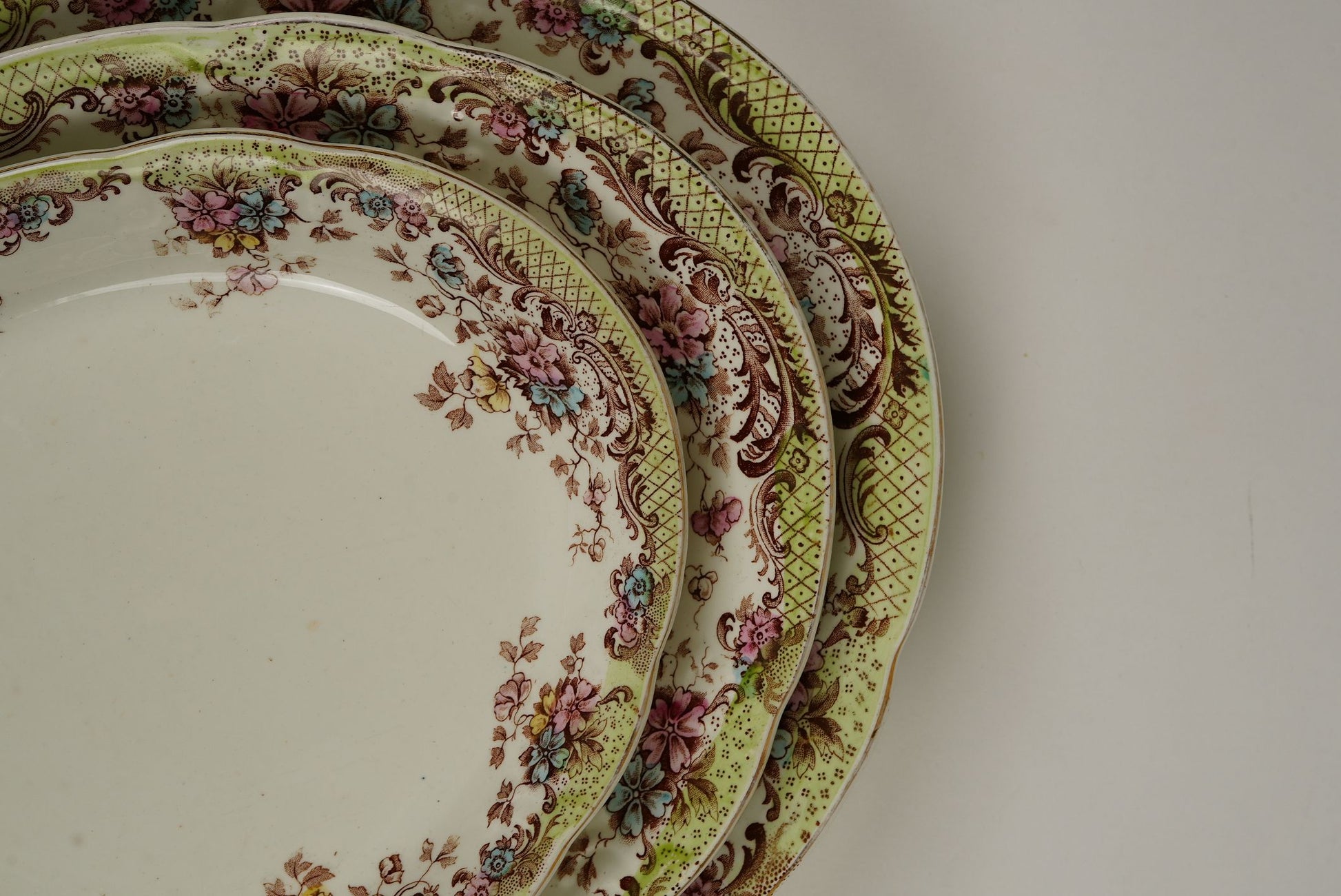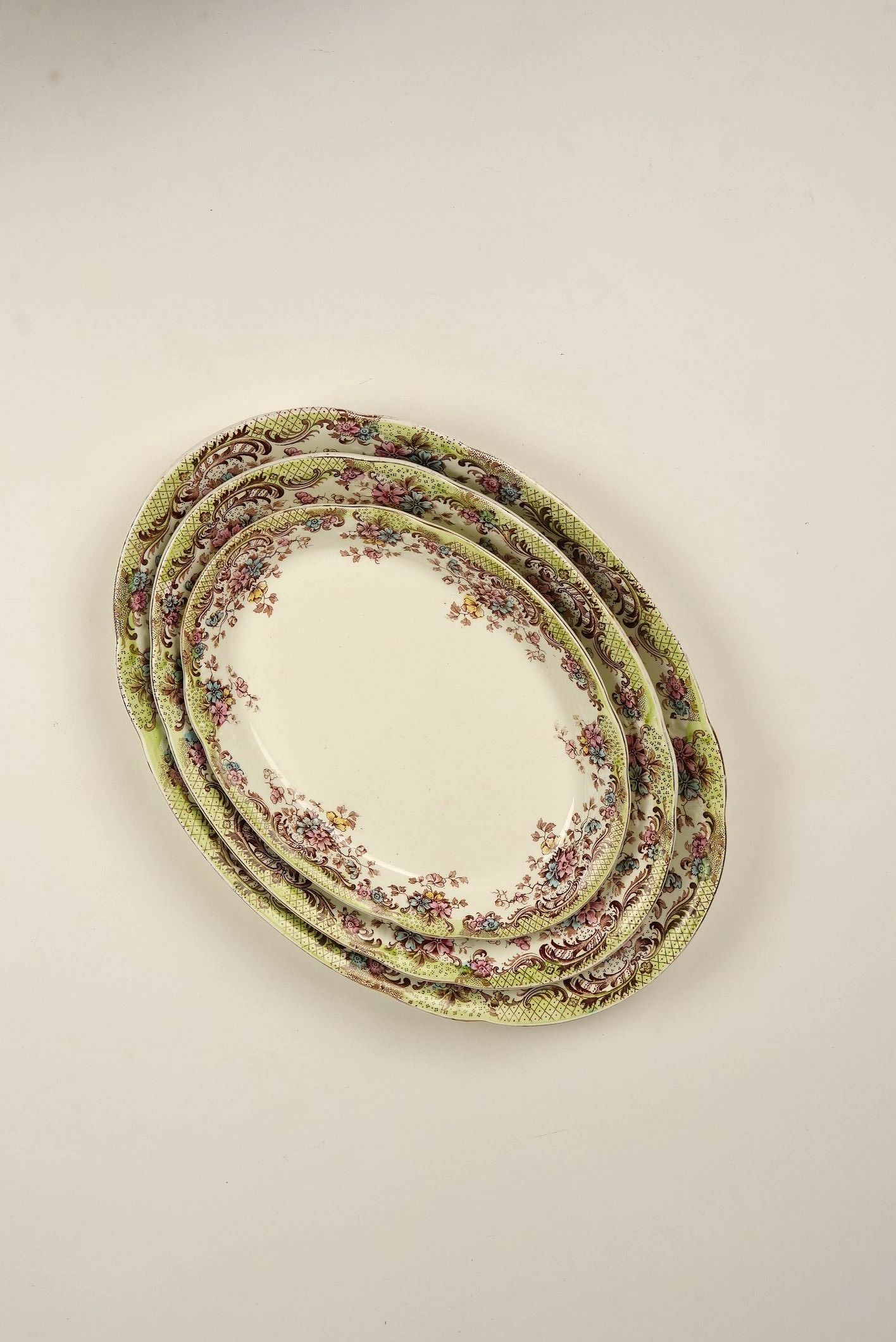 A rare graduated set of three oval platters in the “Maine” pattern by William Northwood, Burslem, England, dating to the late 19th century. Each semi-porcelain piece features a richly decorated floral border in pink, blue, yellow, and green tones, framed by intricate scrollwork and a crosshatch green band. The centers are elegantly reserved, making these pieces ideal both for display and service.