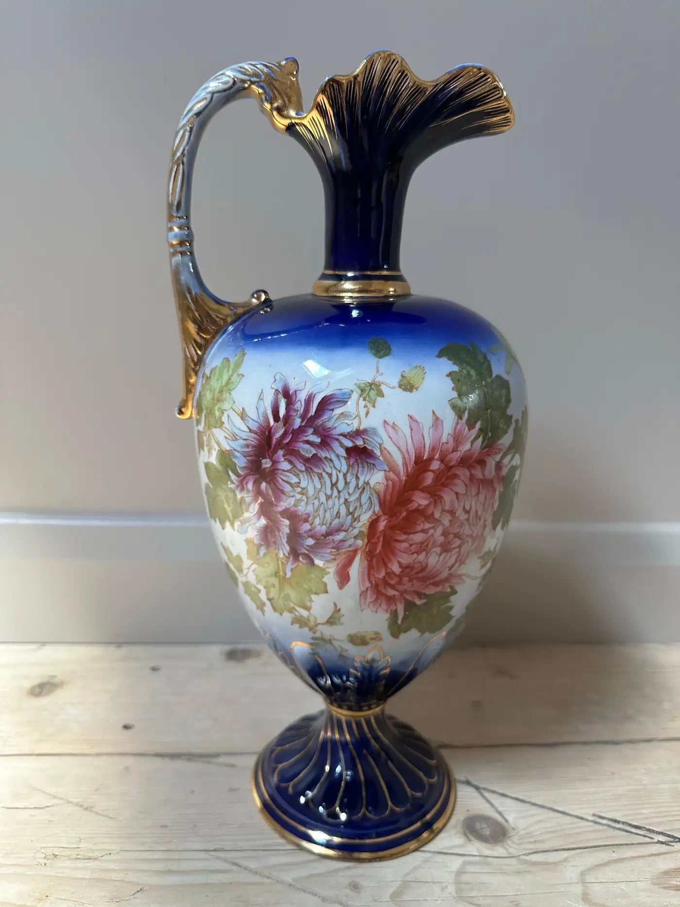 This elegant porcelain pitcher is a beautiful example of English decorative pottery, crafted by the renowned James Kent Ltd., also known as JKL or Old Foley. Known for their timeless ceramic artistry, James Kent pieces are beloved by collectors worldwide. Adorned with a striking floral “Chrysanthemum” motif, this piece showcases the vibrant charm of early 20th-century decorative ware. Its ornate handle, delicate gilded accents, and hand-painted floral details make it a standout display item.