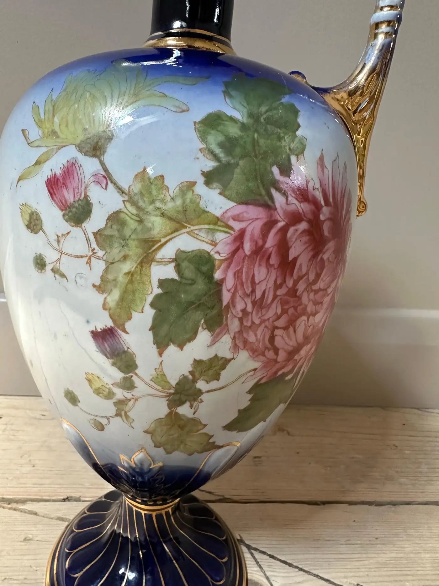 Decorative Porcelain Tall Pitcher — sky‑blue body with pink floral sprays and gilded accents. Romantic and refined, it’s beautiful on a breakfast table or styled with flowers on a mantel.