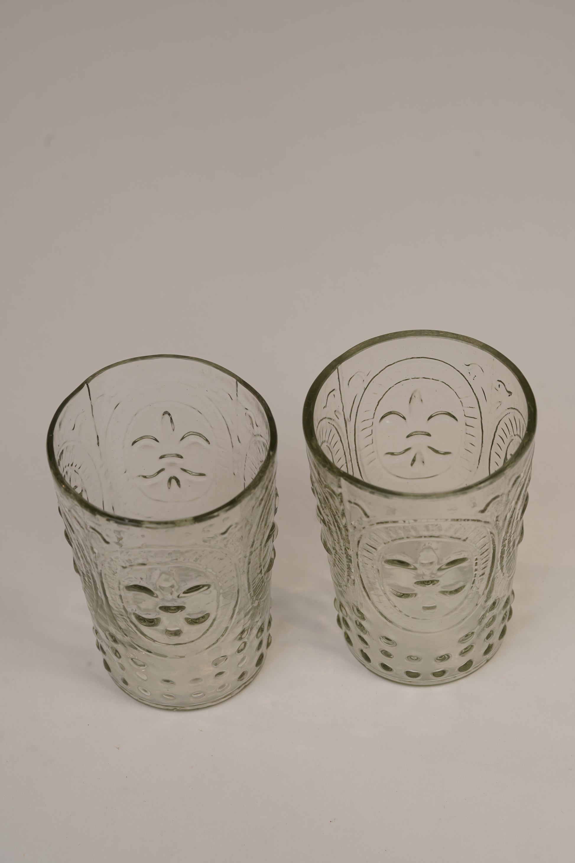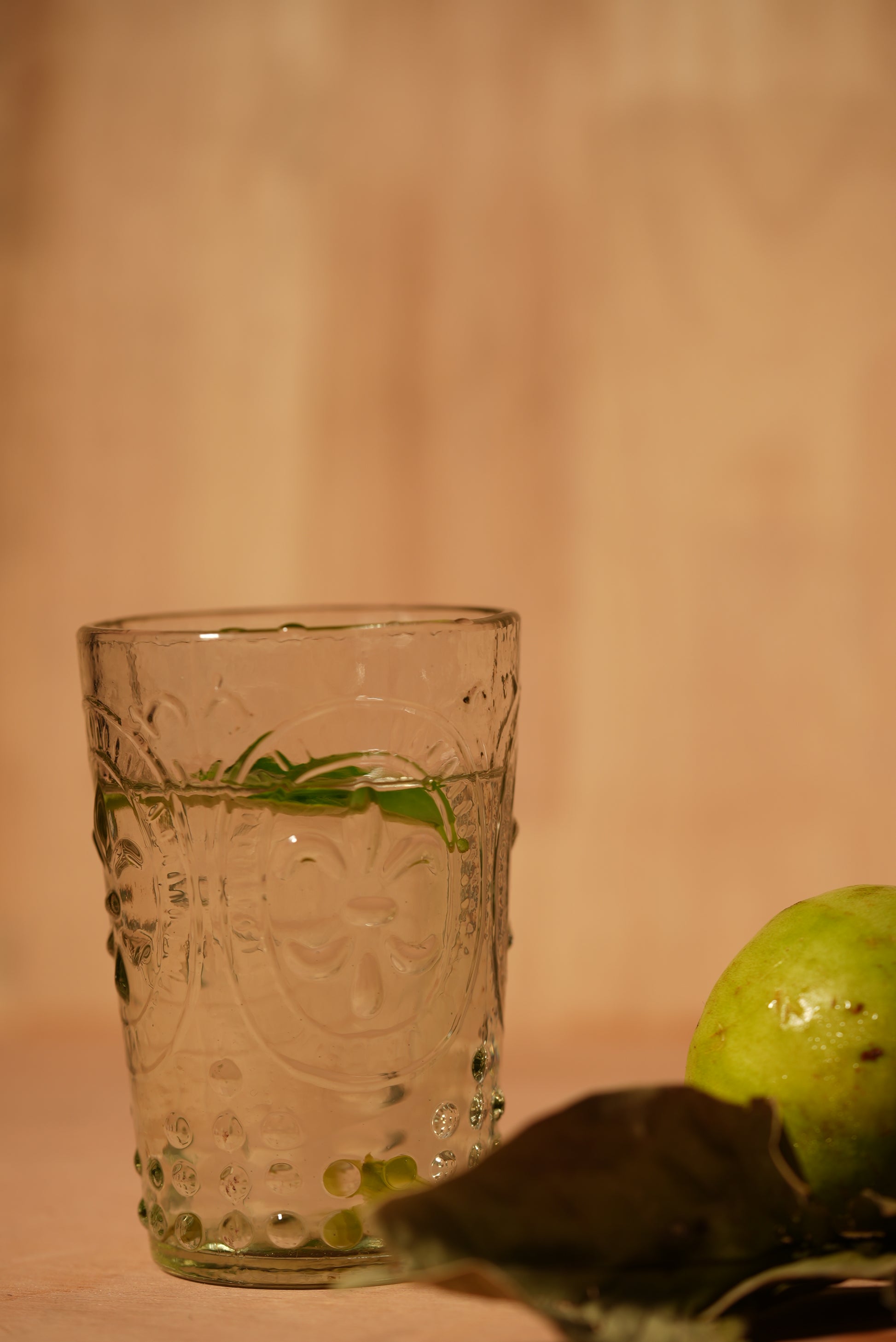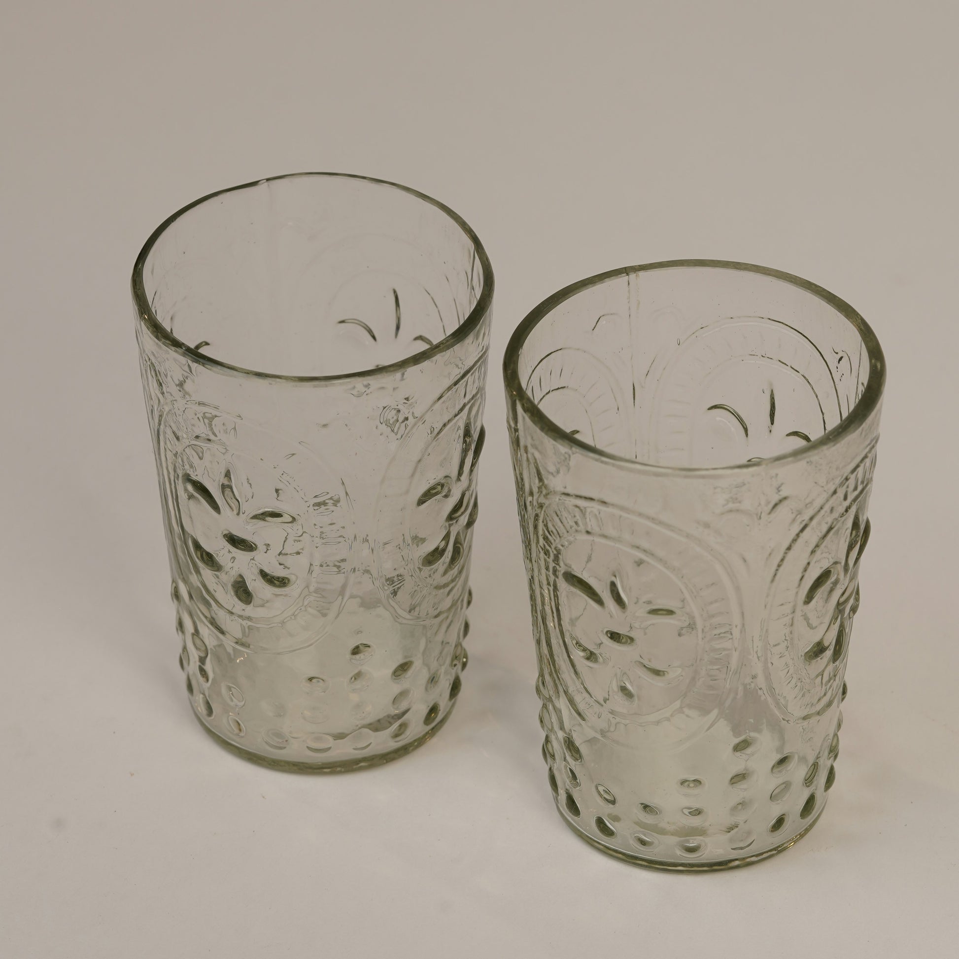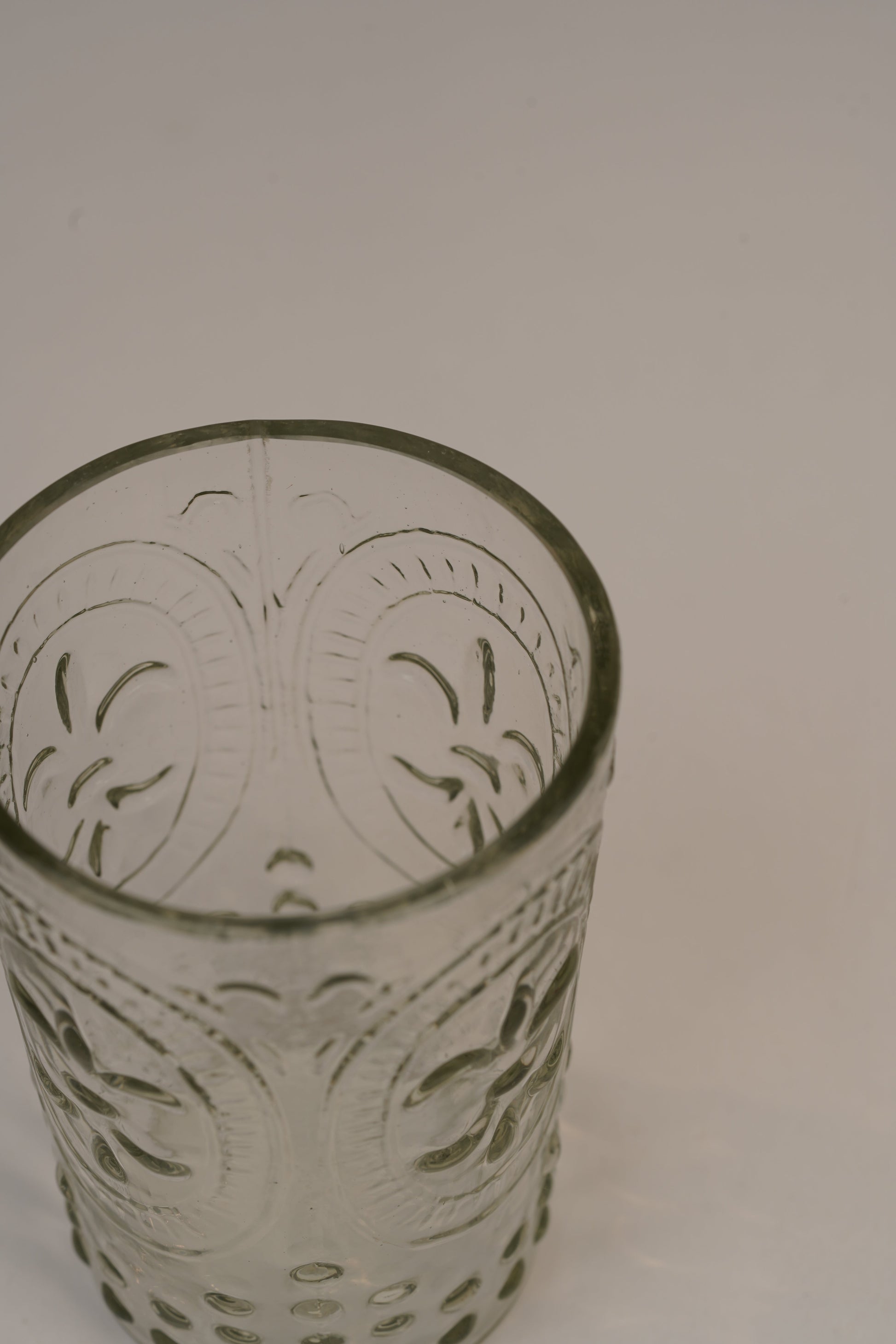 This exquisite water tumbler, handcrafted in India, effortlessly combines artisanal charm with understated elegance. Featuring delicately embossed floral motifs and a subtly textured base, it captures the beauty of traditional craftsmanship.