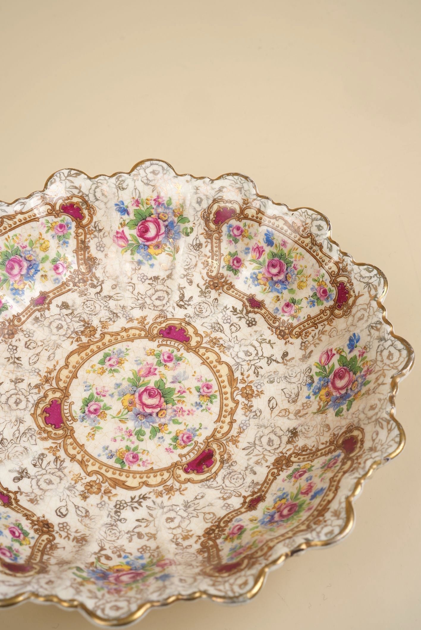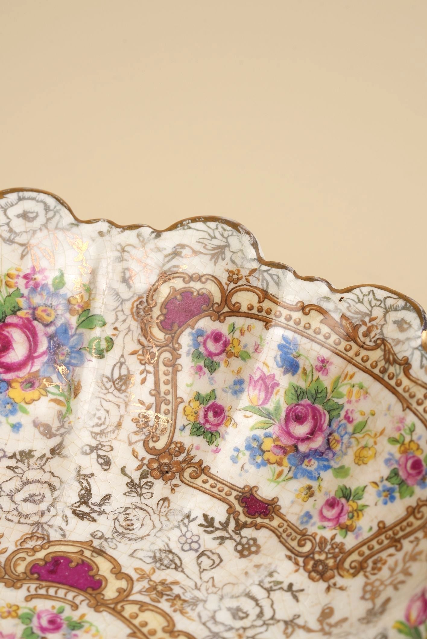 Beautifully shaped with a softly scalloped rim and raised foot, the bowl features an ornate floral design in delicate pinks, blues, and yellows. The interior is richly decorated with hand-applied gilded detailing, intricate scrollwork, and framed floral panels surrounding a central bouquet. Subtle gold edging along the rim enhances its vintage charm and adds a luxurious finishing touch.