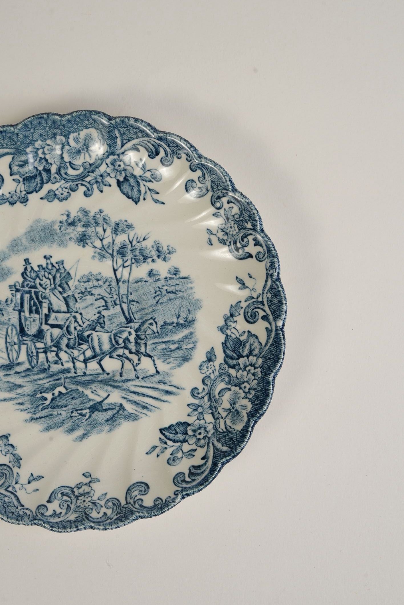 The “Coaching Scenes” pattern, introduced in the mid-20th century, draws inspiration from 19th-century rural life, when horse-drawn stagecoaches carried travelers between towns before the rise of the railway. Johnson Brothers produced several variations of this pattern, often in blue or brown, each depicting charming vignettes full of character and movement.