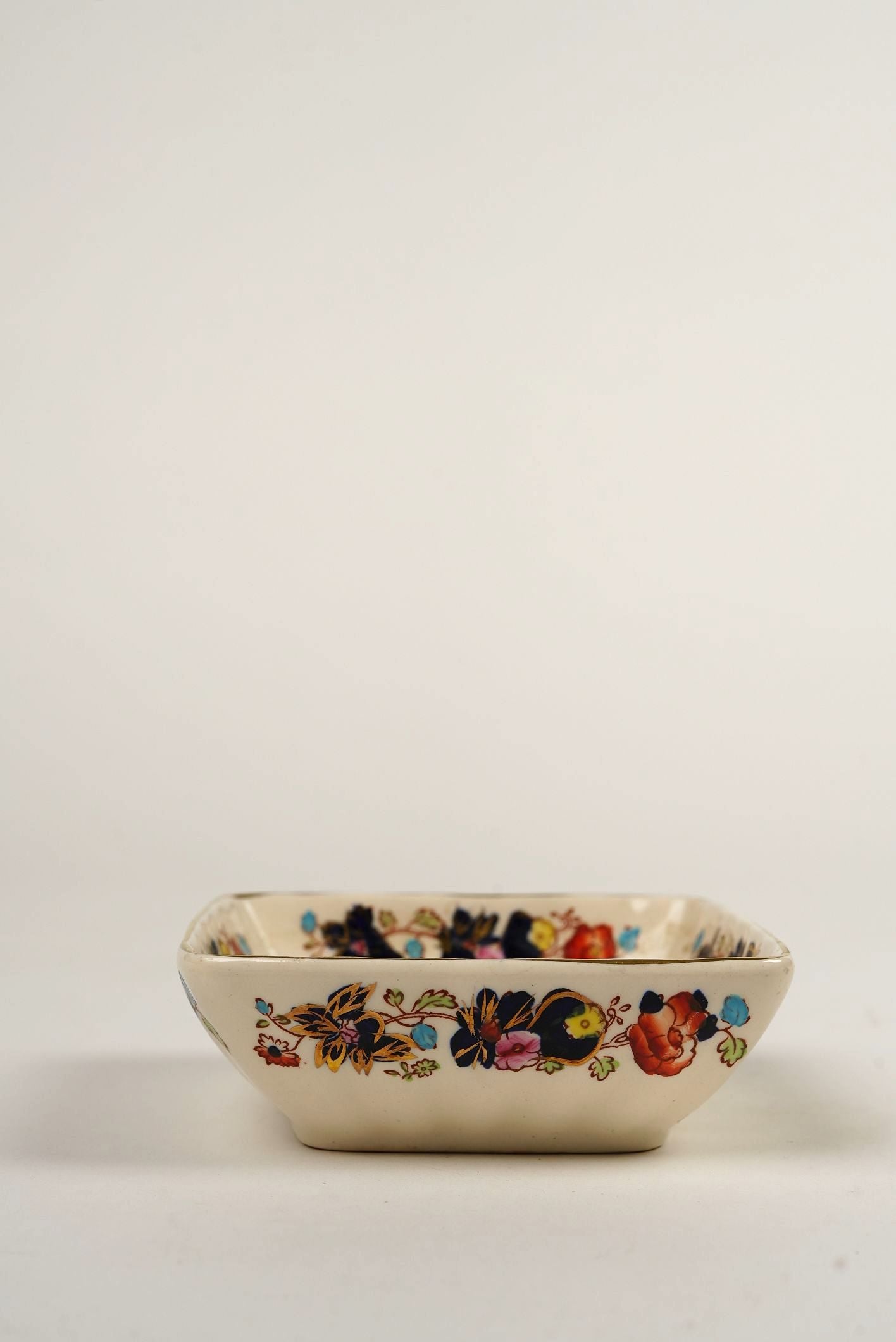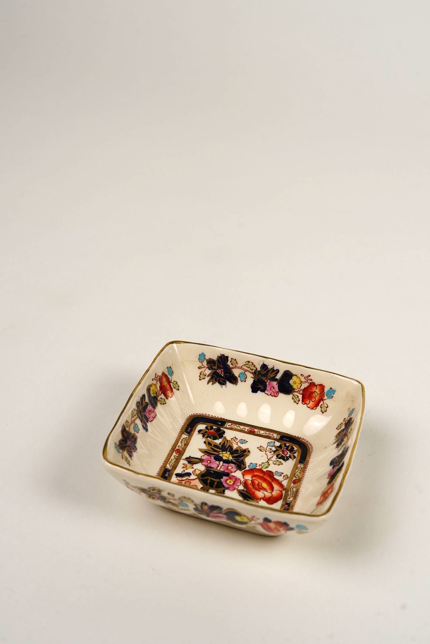 This vibrant square trinket dish by Mason’s Ironstone features the richly colored “Mandarin” pattern, a striking celebration of Oriental floral motifs. The central medallion blooms with deep navy, cherry red, and blush pink florals—outlined in fine gilt detailing—while the walls are adorned with scattered blossoms, echoing the same lush palette.