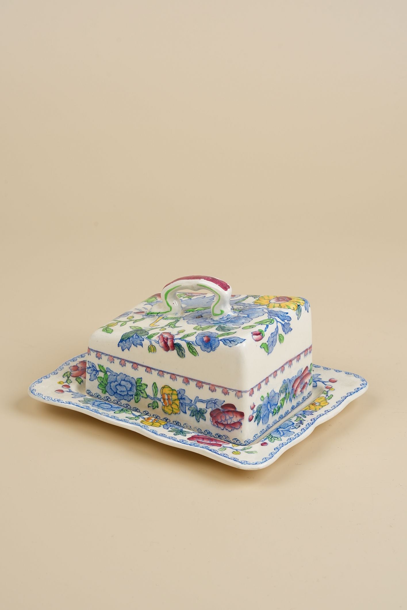 A beautifully decorative vintage butter dish in the classic Regency pattern by Mason’s Ironstone. This eye-catching piece features vibrant cobalt blue florals with red, yellow, and green accents on a creamy white ironstone base, showcasing the richly detailed and timeless Regency design.