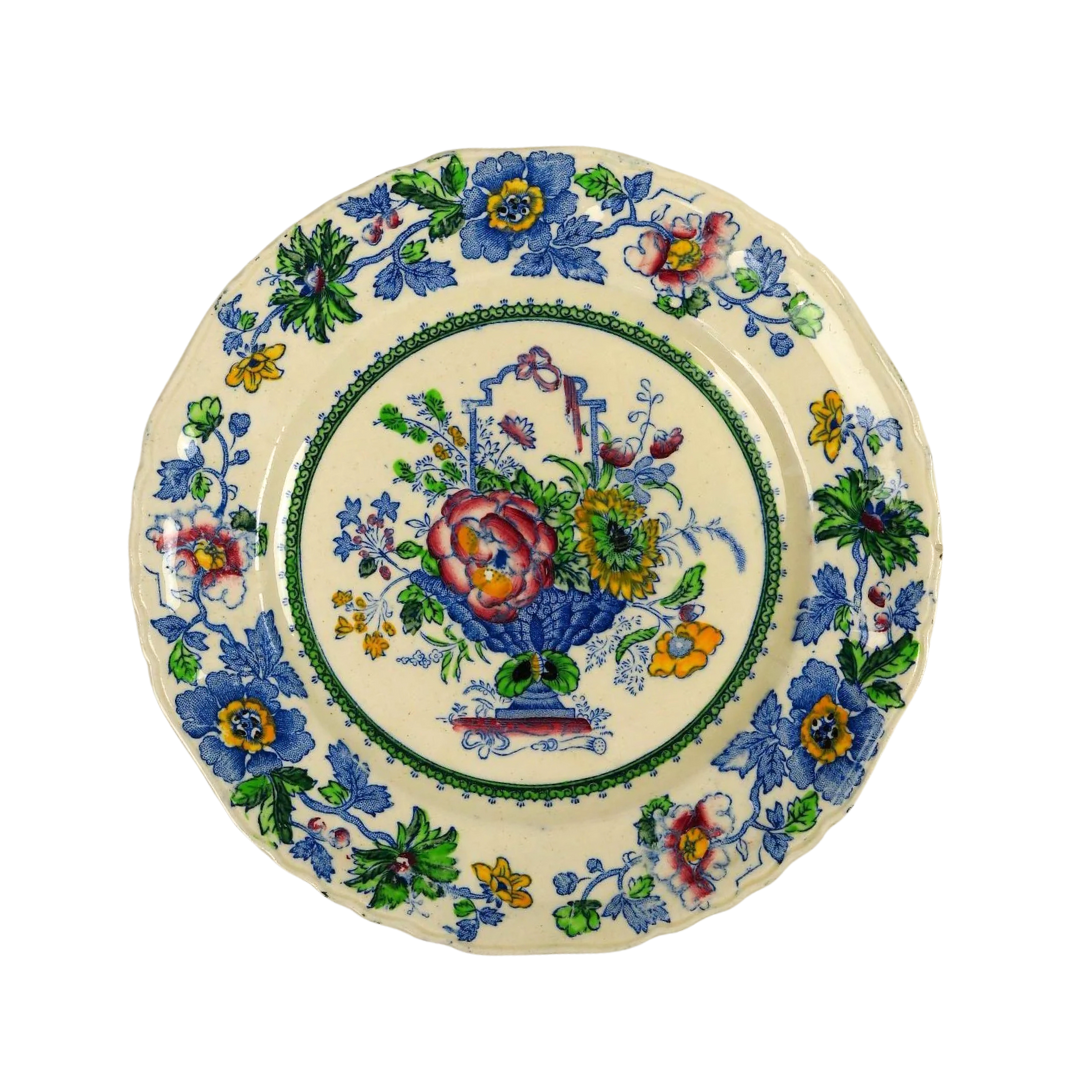 These side plates are a fine example of Mason’s Strathmore pattern, a richly detailed and vibrant floral design that instantly elevates a table setting. Each plate features a central basket of abundant blooms surrounded by a border of trailing flowers in vivid blues, reds, greens, and yellows. The scalloped edges add a refined touch, giving these plates a distinctive character that sets them apart from plainer dinnerware.