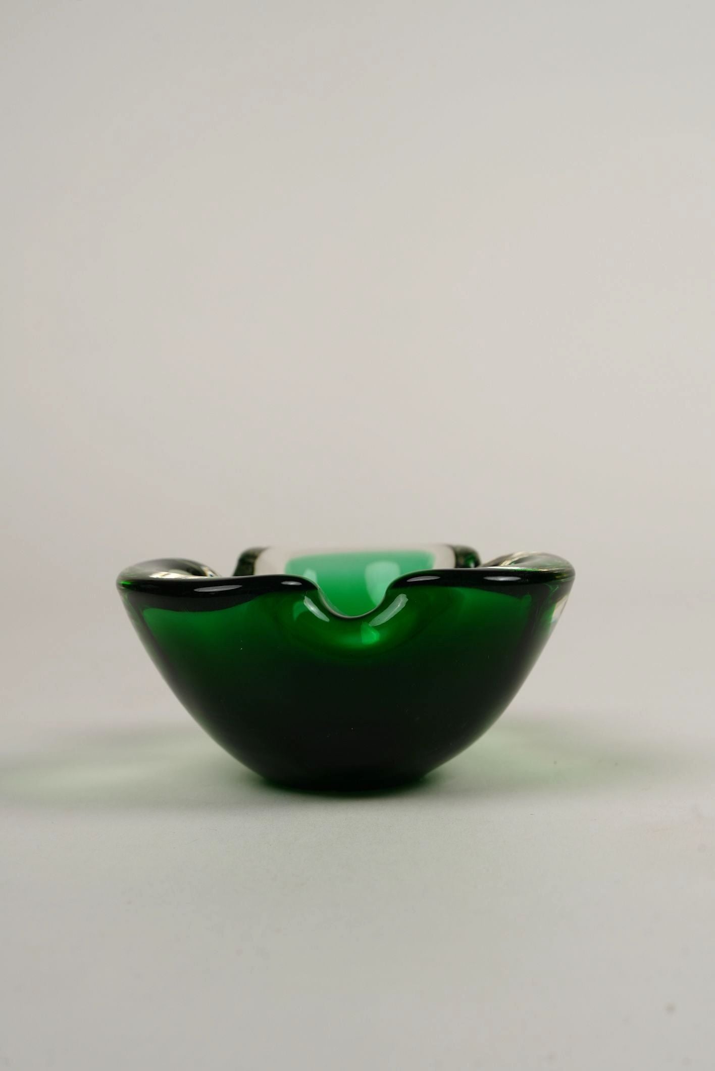 A striking example of mid-century Murano artistry, this hand-blown glass ashtray features rich emerald green tones encased in clear crystal, flowing seamlessly into organic curves. The heavy base and smooth finish highlight the sommerso technique, where layers of colored glass are submerged within transparent crystal, creating a jewel-like depth and brilliance.