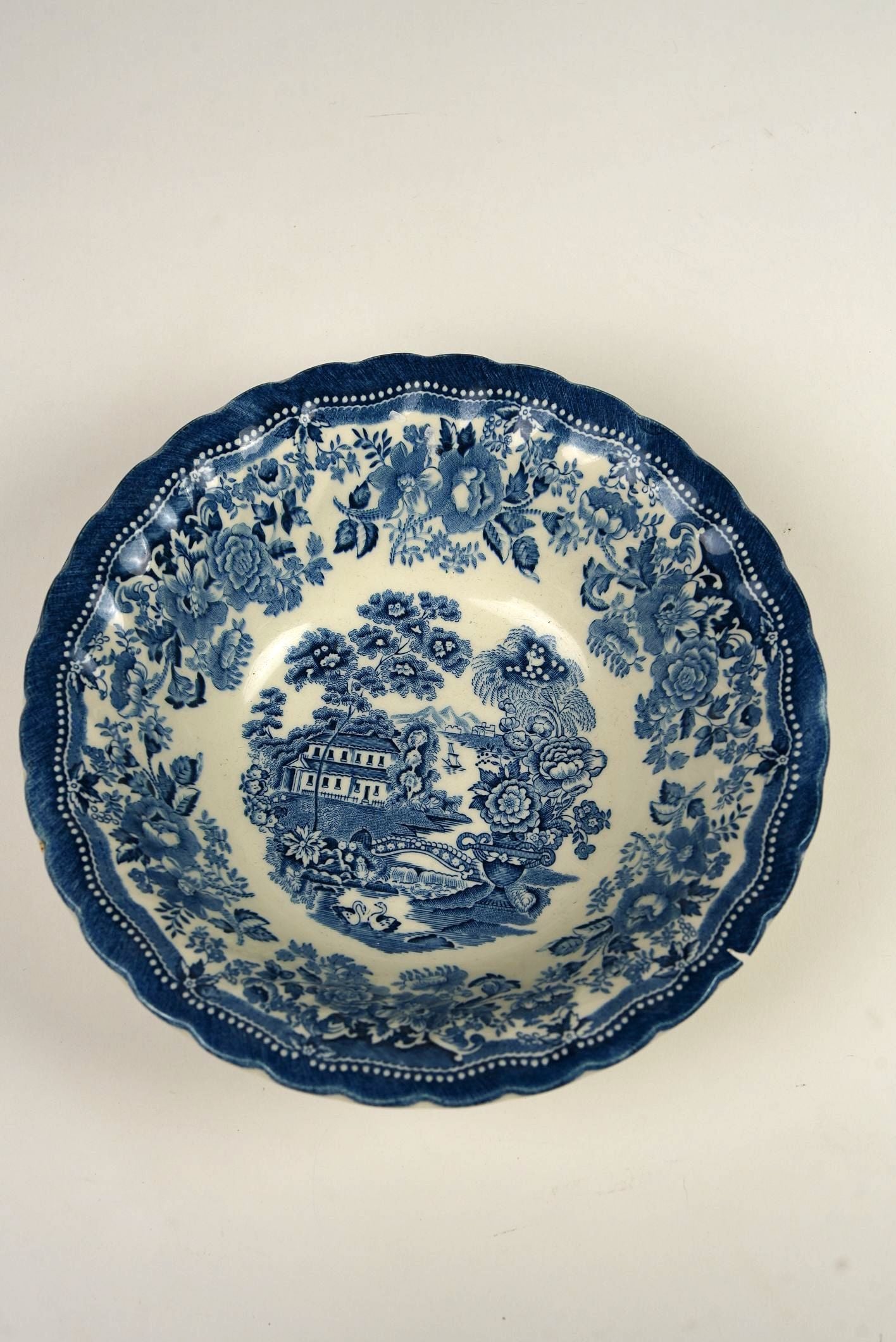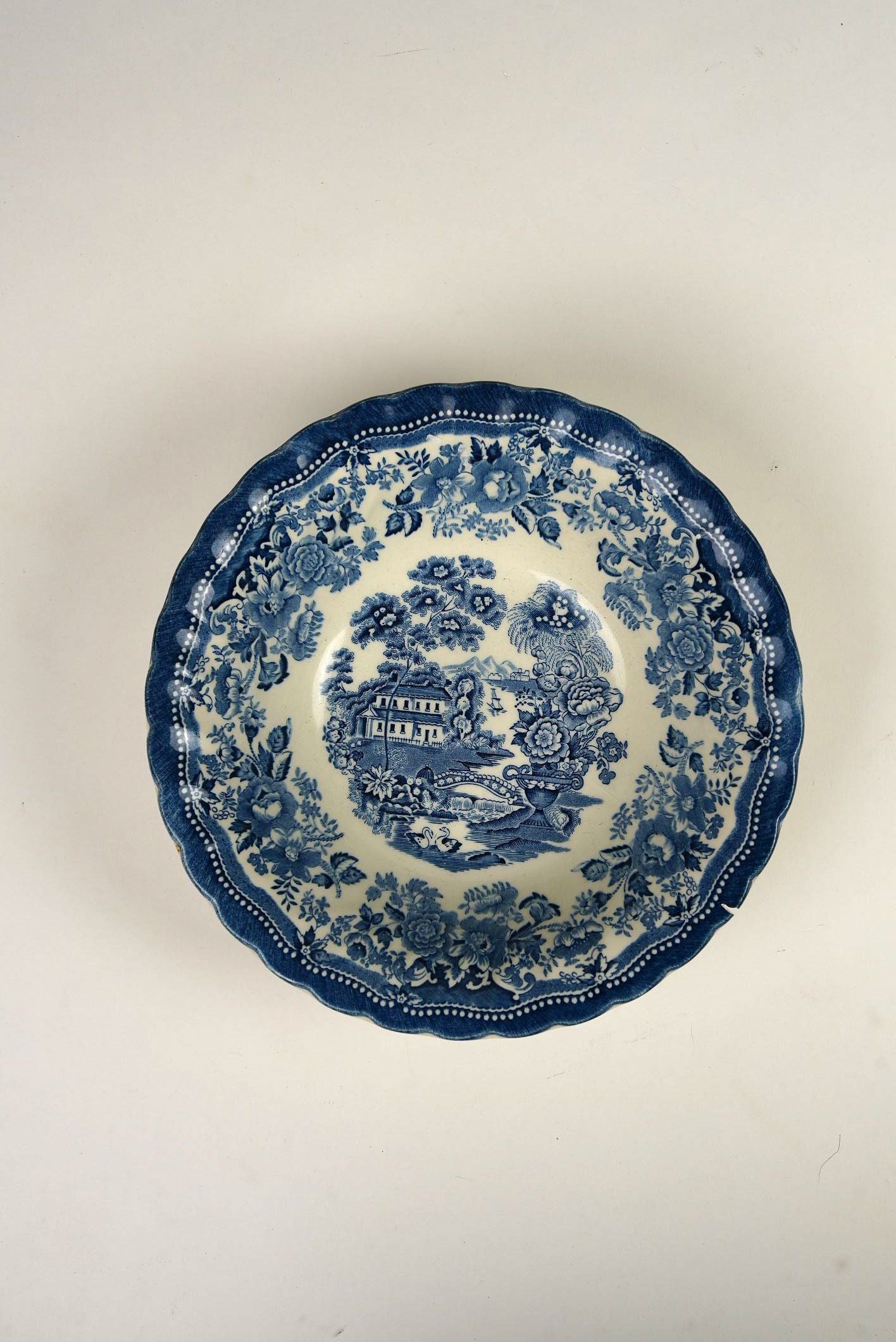 This bowl is a classic example of English transferware, crafted by Myott, one of Staffordshire’s respected 20th-century potteries. The deep cobalt blue scene depicts a pastoral landscape with a stately home, trees, and florals, framed by a richly decorated floral border. Its scalloped edges give it an added touch of refinement, while the intricate details of the design showcase the artistry that made English blue-and-white ware beloved worldwide.