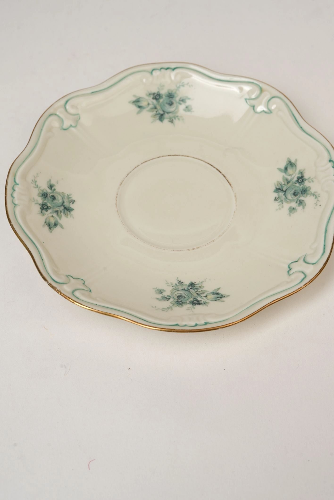- Style: Teal floral sprays, scalloped edges, gold trim