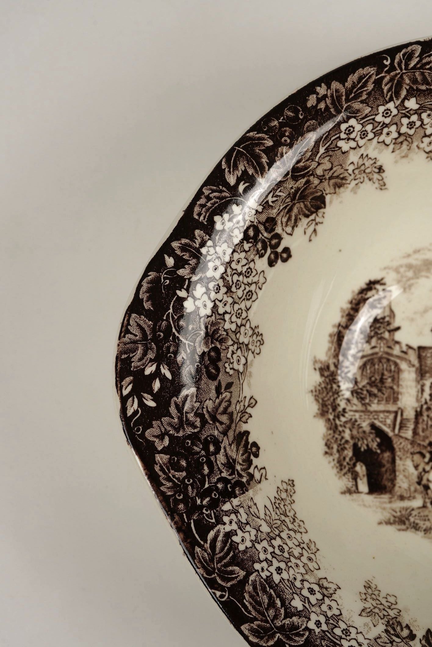 Bring a touch of English heritage to your collection with this vintage transferware bowl from the Romantic England series. Featuring the historic Warwick West Gate and Leicester Hospital, this beautifully detailed piece captures centuries of tradition and craftsmanship. With its ornate floral border and sepia-toned illustration, it makes a striking addition to any table or display cabinet.