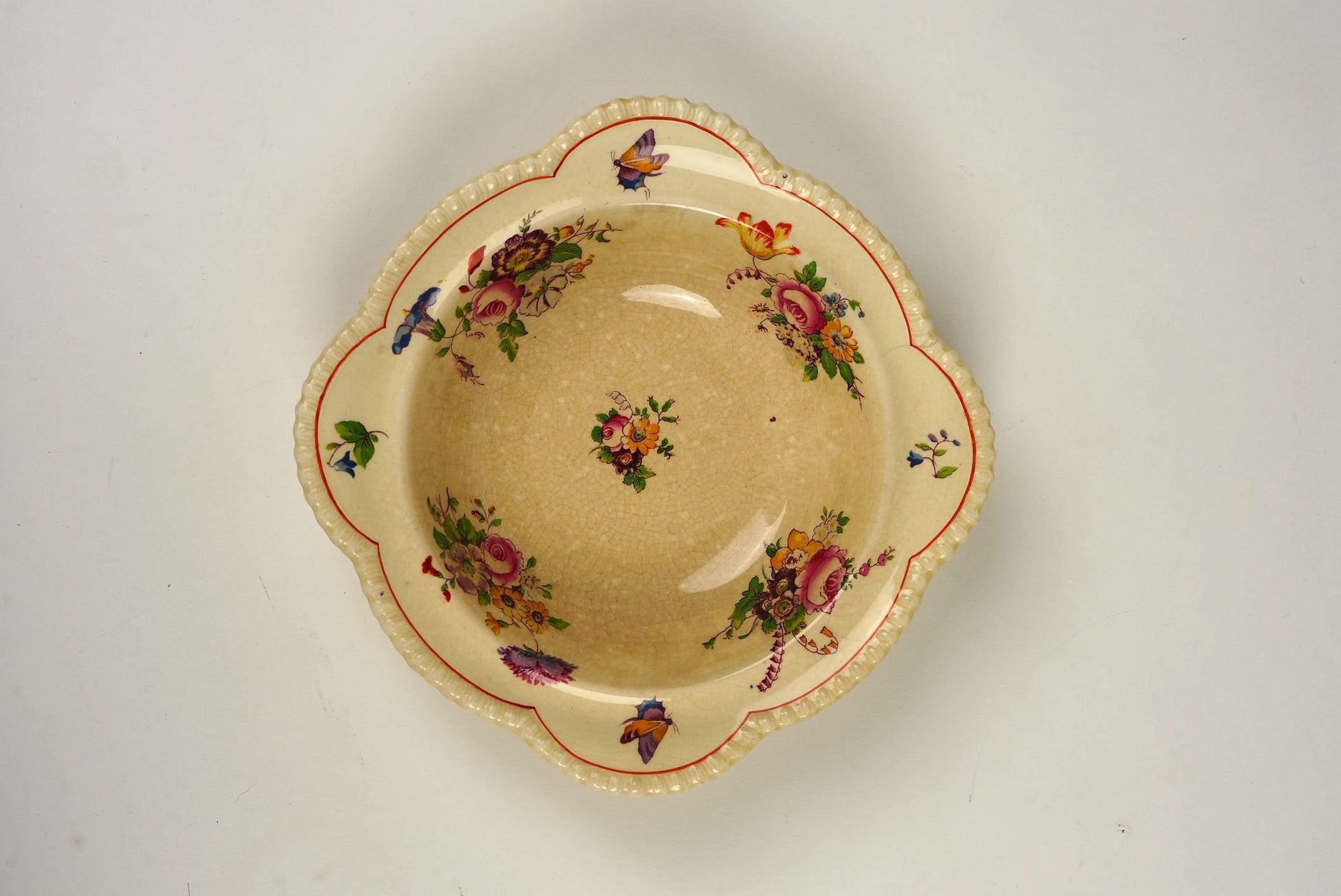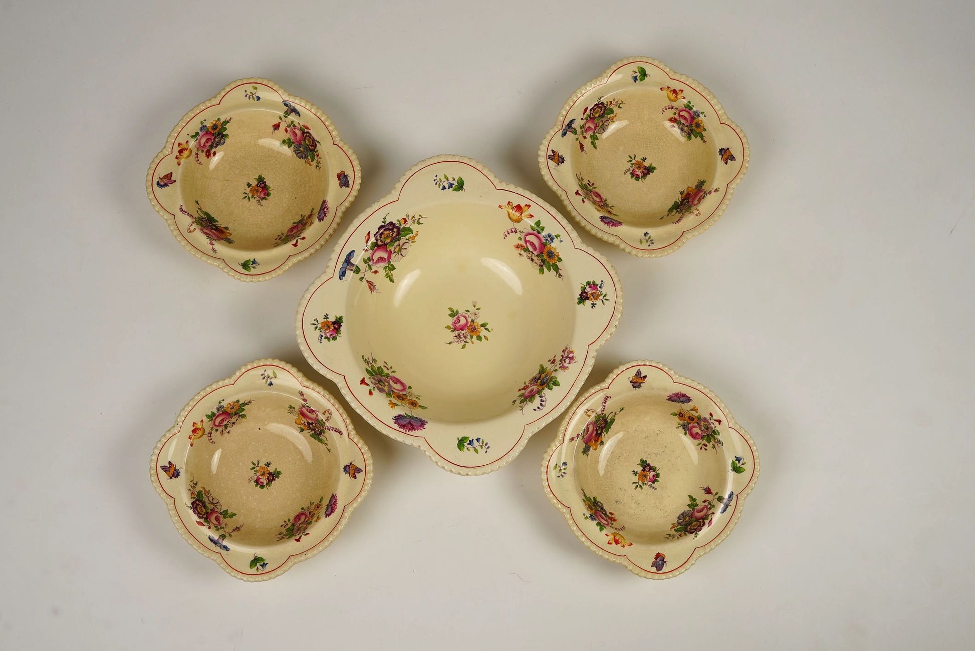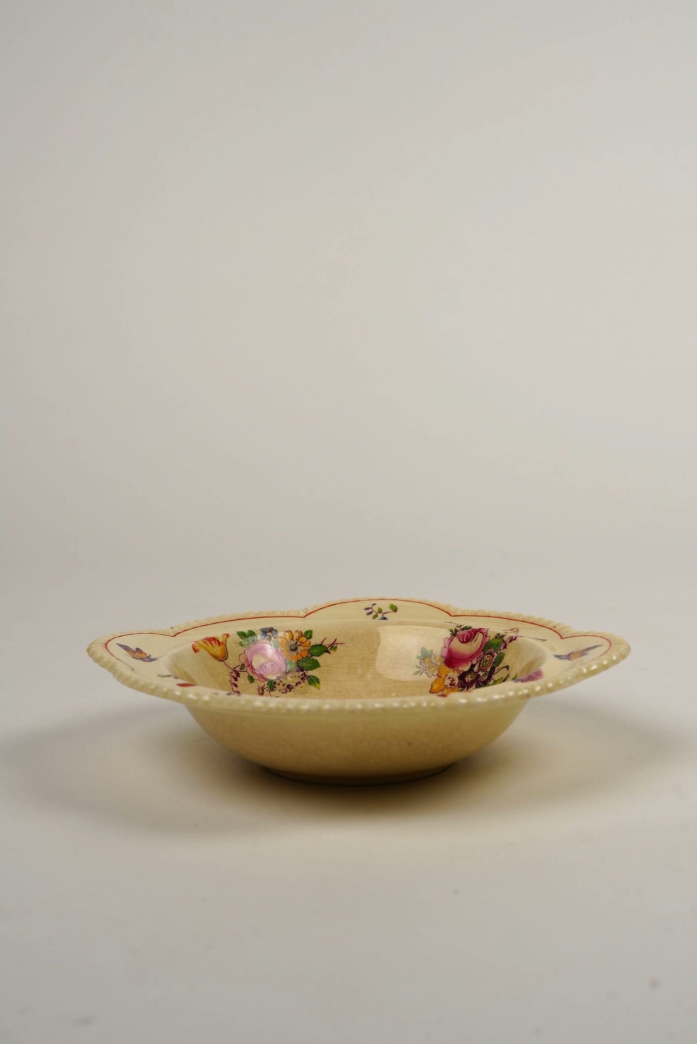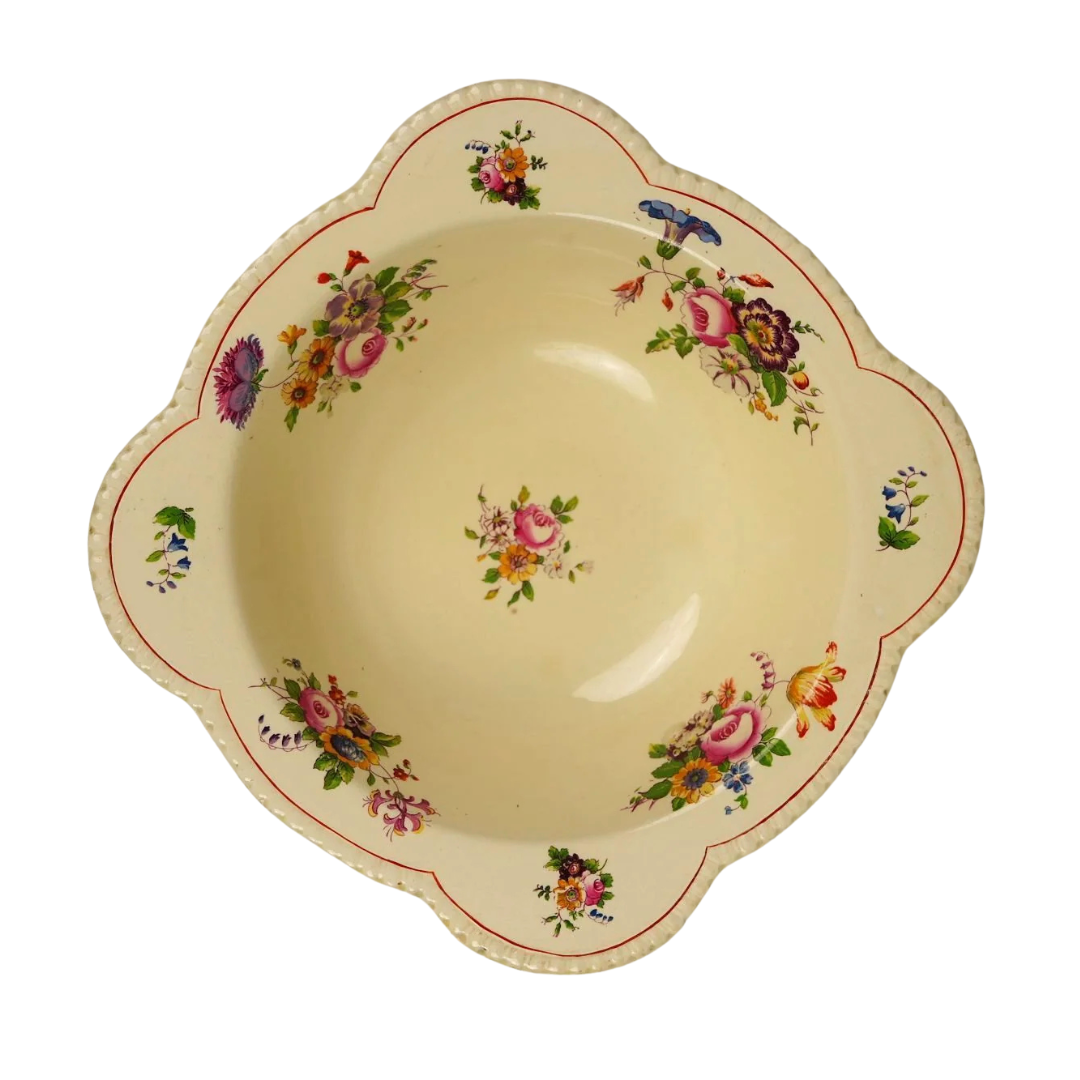 A set of four Royal Cauldon dessert bowls, each hand-painted with colourful floral sprays on a warm cream ground. Featuring scalloped and beaded rims with red trim, these English earthenware bowls carry the Royal Cauldon, England Est. 1774 backstamp with registered design number, dating them to the 1930s–40s. Perfect for collectors of fine Staffordshire pottery or for elegant dessert service.
