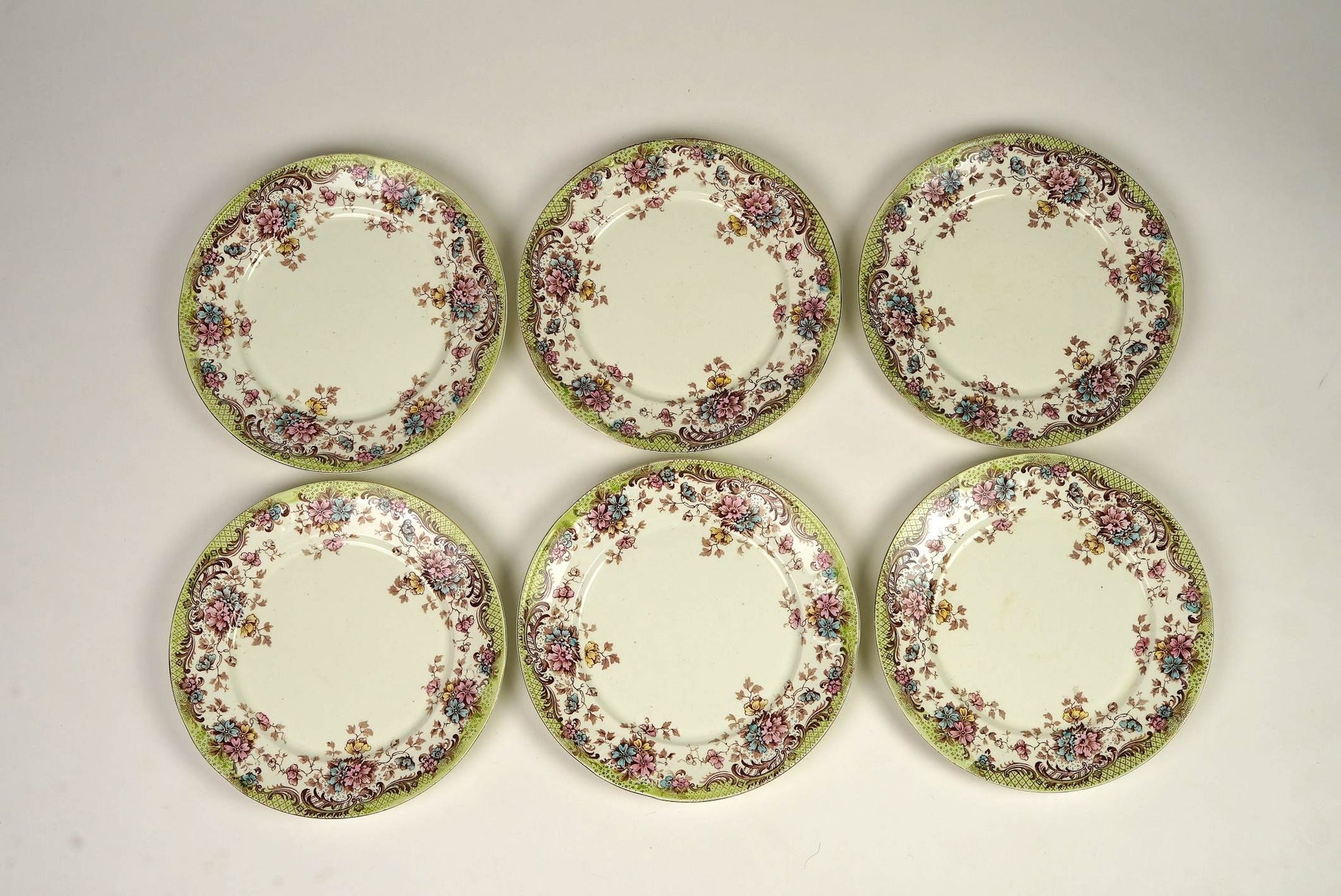 A rare and finely decorated set of 10 lunch plates, each measuring 9 inches, by William Northwood, Burslem, England, dating to the late 19th century. The “Maine” pattern features a richly detailed floral motif in multicolour tones of pink, blue, yellow, and green, accented by intricate scrolling cartouches and a textured border. This vibrant palette, combined with Northwood’s distinctive transfer technique, gives the plates exceptional decorative presence.
