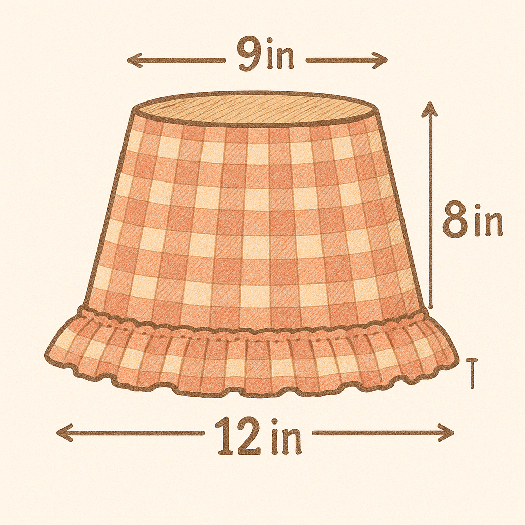 It measures 9 inches across the top, 12 inches at the bottom, and 8 inches in height, finished with a delicate 3 cm ruffled frill along the edge for a sweet, cottage-style touch.