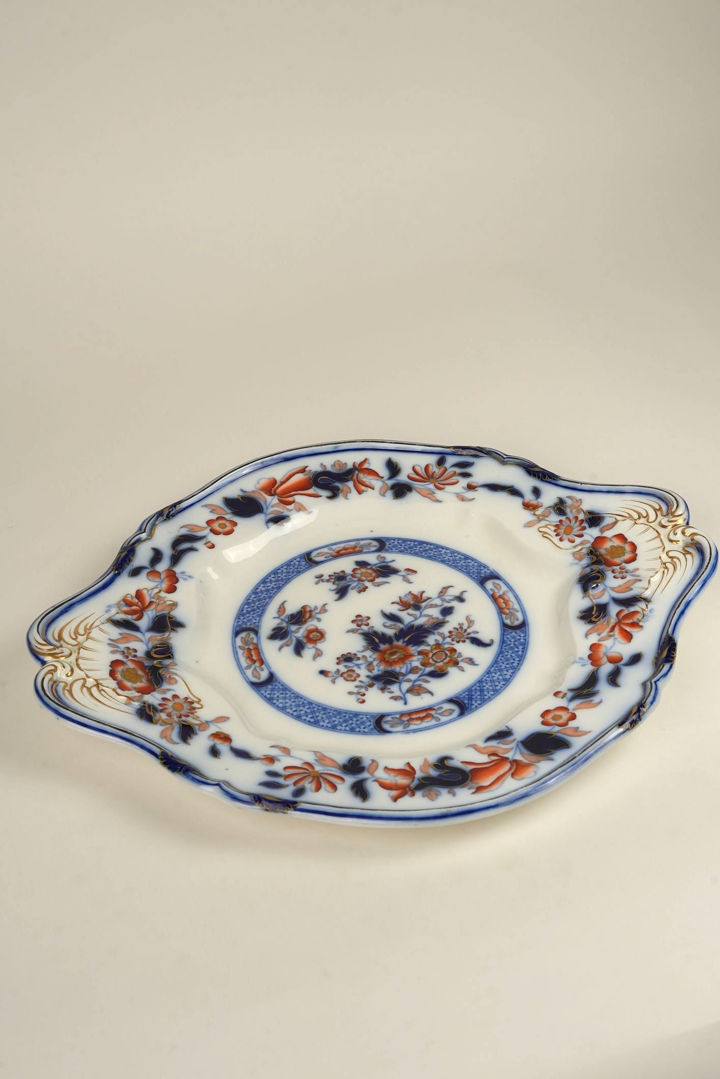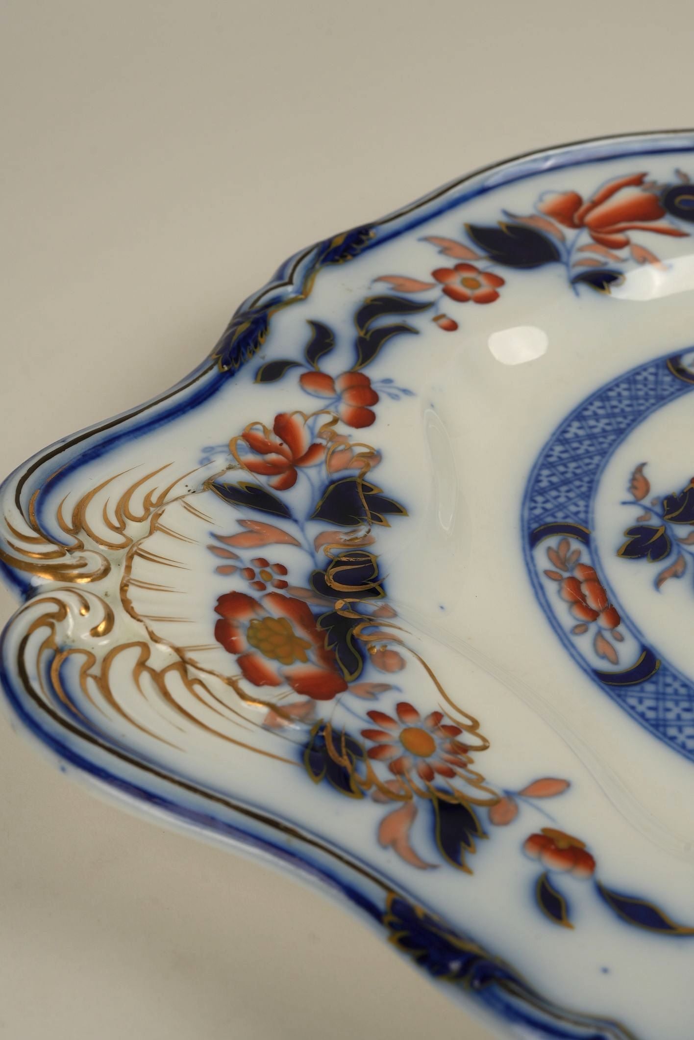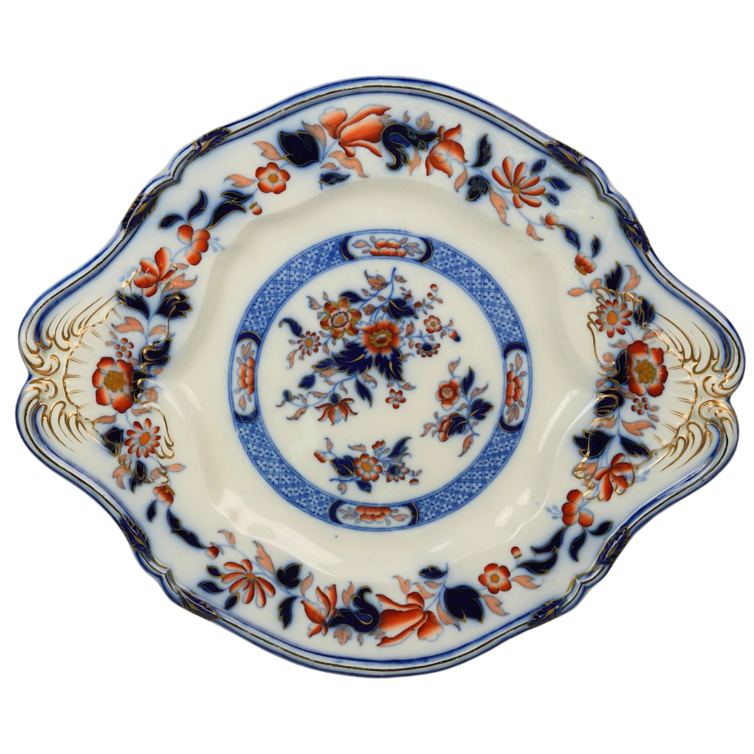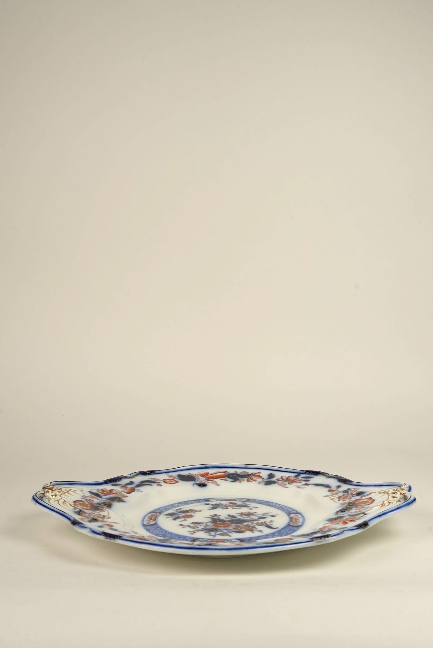 This is a generously proportioned, ornately shaped Victorian platter, designed to impress. The central medallion blooms with a vibrant bouquet of stylized florals, encircled by intricate borders. The gently scalloped rim features hand-painted sprays in orange and navy, accented by fine gold flourishes. It’s stately yet warm — the kind of piece that feels at home in both traditional and eclectic interiors.