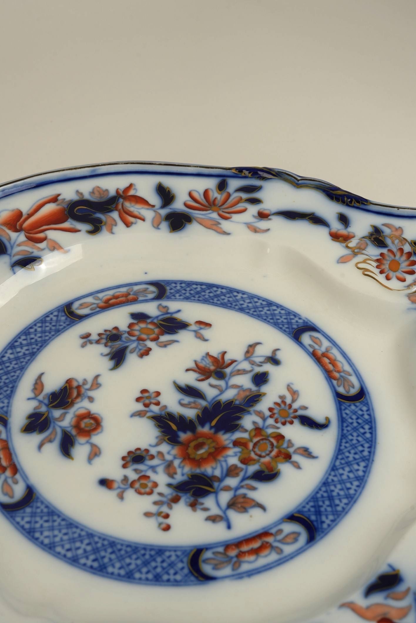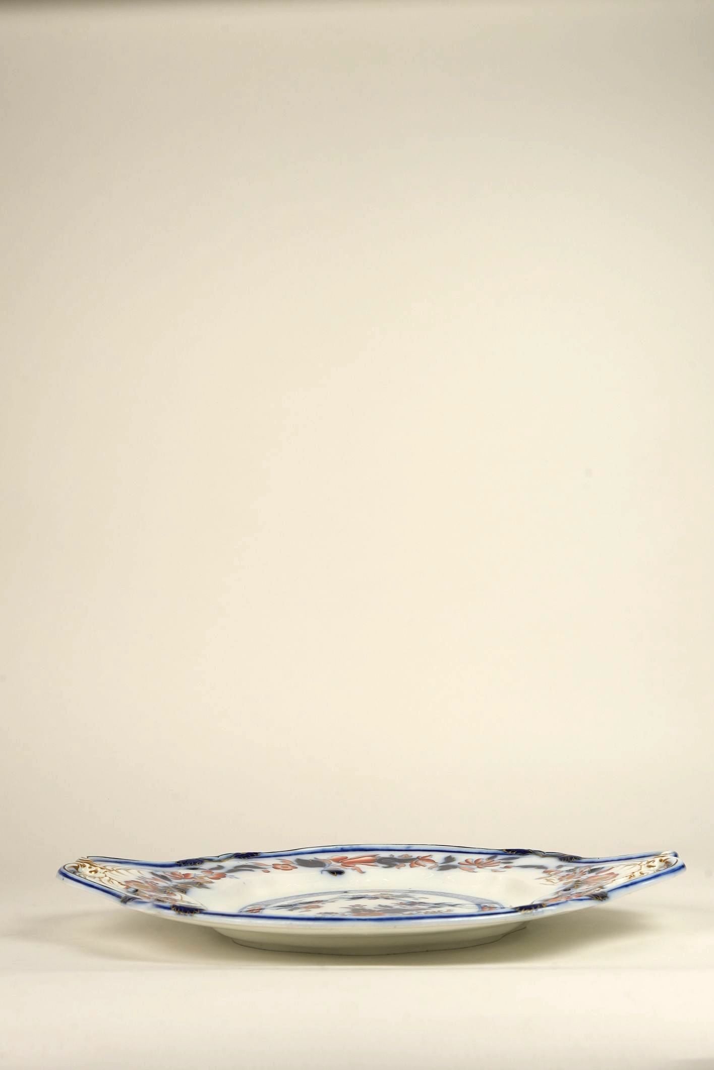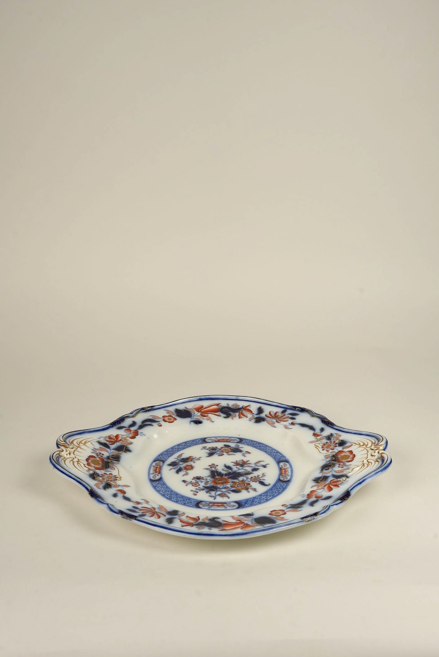 This is a generously proportioned, ornately shaped Victorian platter, designed to impress. The central medallion blooms with a vibrant bouquet of stylized florals, encircled by intricate borders. The gently scalloped rim features hand-painted sprays in orange and navy, accented by fine gold flourishes. It’s stately yet warm — the kind of piece that feels at home in both traditional and eclectic interiors.
