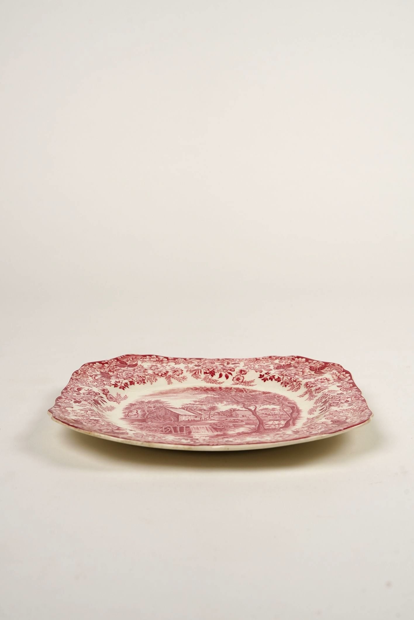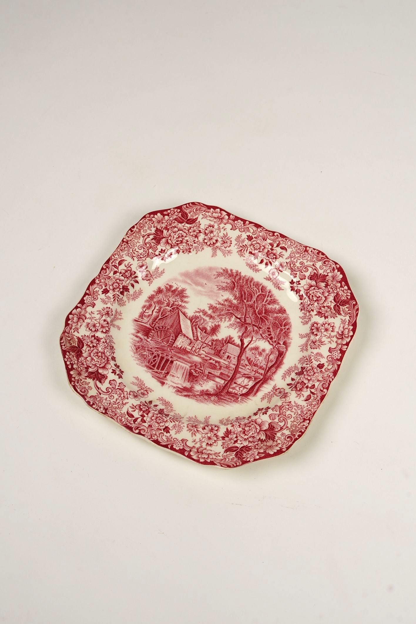 Add timeless charm to your table or display with this exquisite vintage red transferware plate, featuring a detailed pastoral “Old Mill” countryside scene. The intricate red and white design captures a rustic mill by the river, surrounded by trees and cottages, evoking classic 19th-century English countryside artistry.