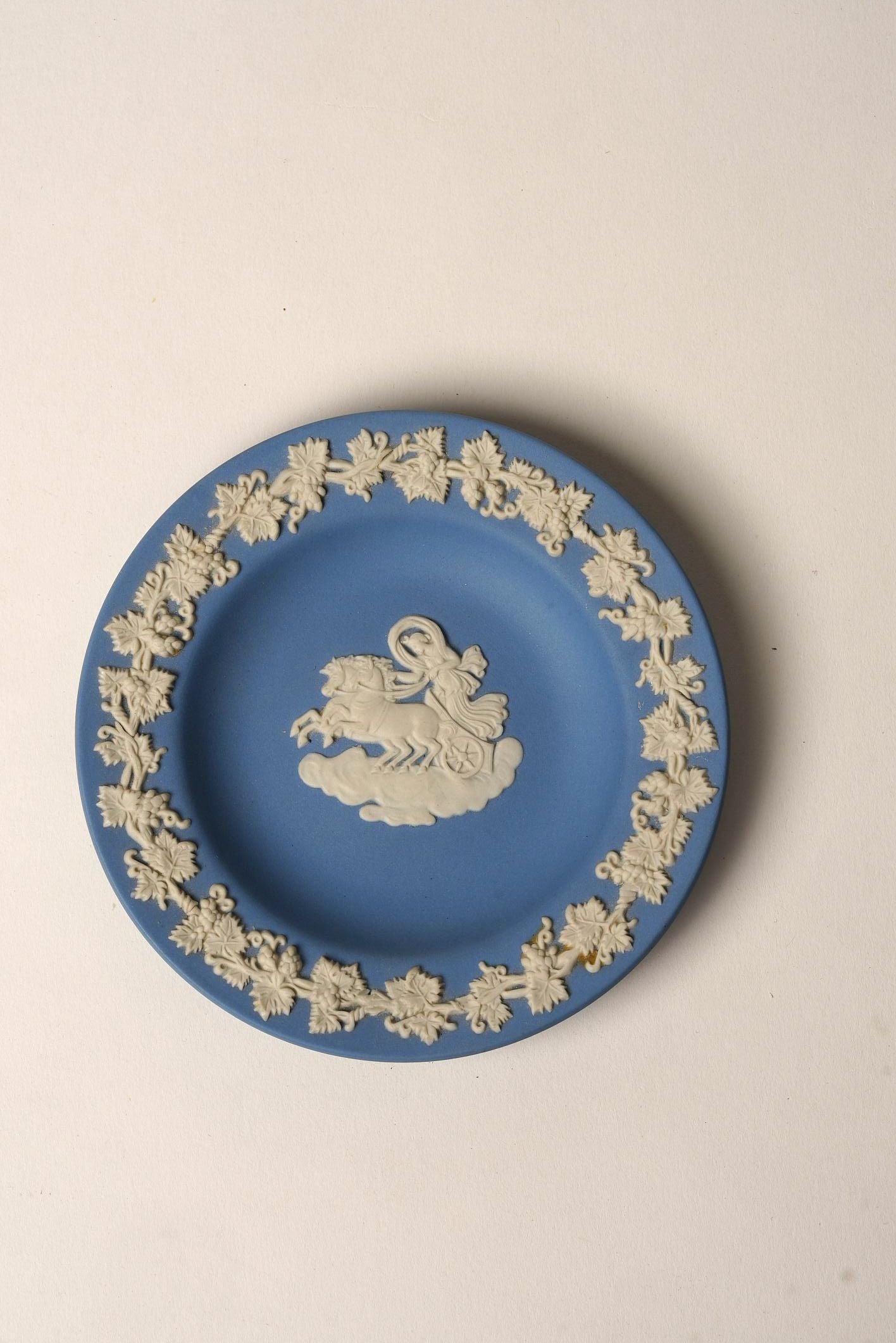 This Wedgwood Jasperware plate showcases the brand’s iconic blue matte finish accented with a striking white relief design. At its center, a classical scene depicts a charioteer with horses, while the border is adorned with an intricate garland of grapevines and leaves, creating a harmonious balance of artistry and elegance.